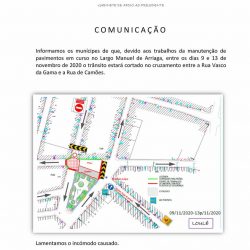 Corte de trânsito no cruzamento entre a Rua Vasco da Gama e a Rua de Camões, em Loulé, entre os dias 9 e 13 de novembro por motivo de obras.